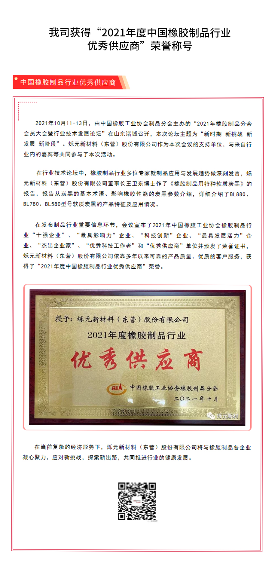 我(wo)司獲得“2021年度(dù)中國橡膠制(zhì)品行業 優秀(xiu)供應商”榮譽(yu)稱号