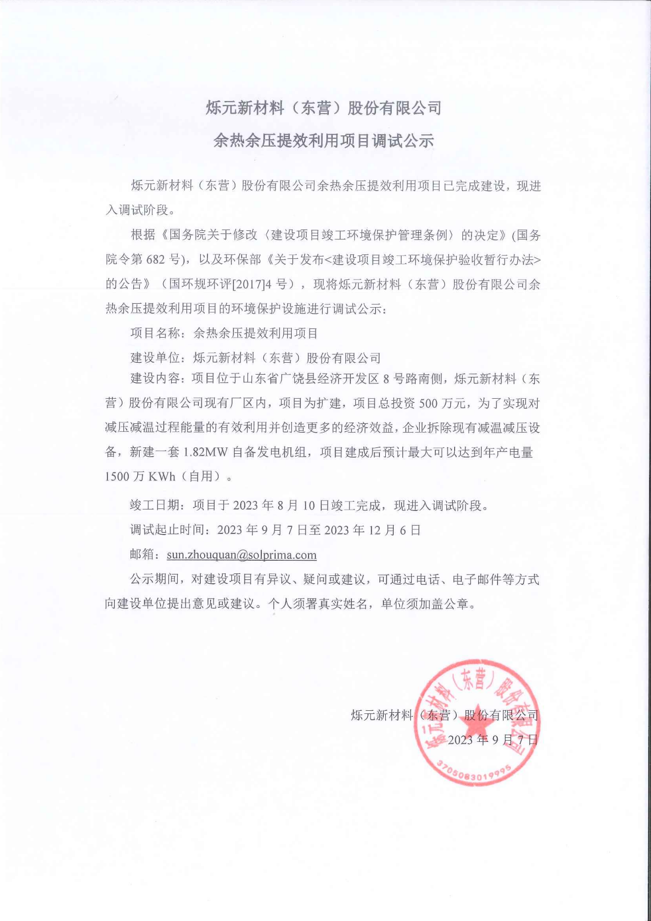 石(shi)家庄义浩机(jī)械制造有限(xian)公司餘熱餘(yu)壓提效利用(yong)項目調試公(gong)示